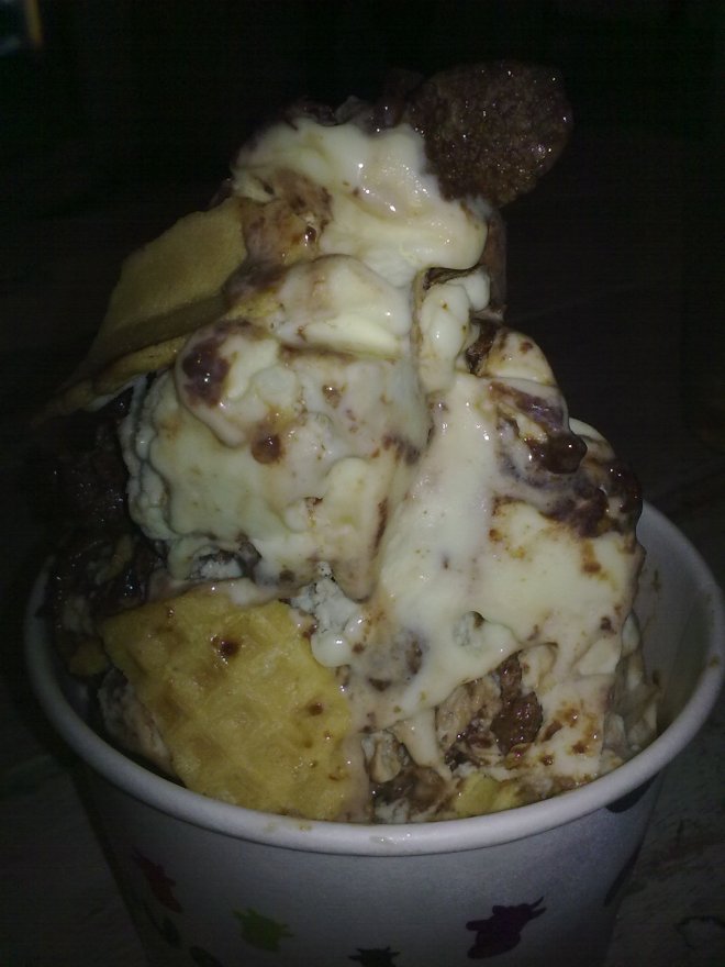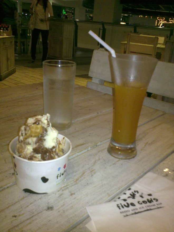 Lunch at Five Cows, which I thought was just an ice cream bar. They serve real food (I had their chicken and fish combo), but I only took pictures of our desserts.