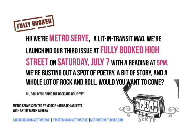metro serye issue 3 launch There’s this thing happening this Saturday! Metro Serye Issue 3 launch. Fully Booked High Street. 5 pm. Share this: Share on X (Opens in new window) X Share on Facebook (Opens in new window) Facebook Email a link to a friend (Opens in new window) Email Share on Reddit (Opens in new window) Reddit Like Loading... Related