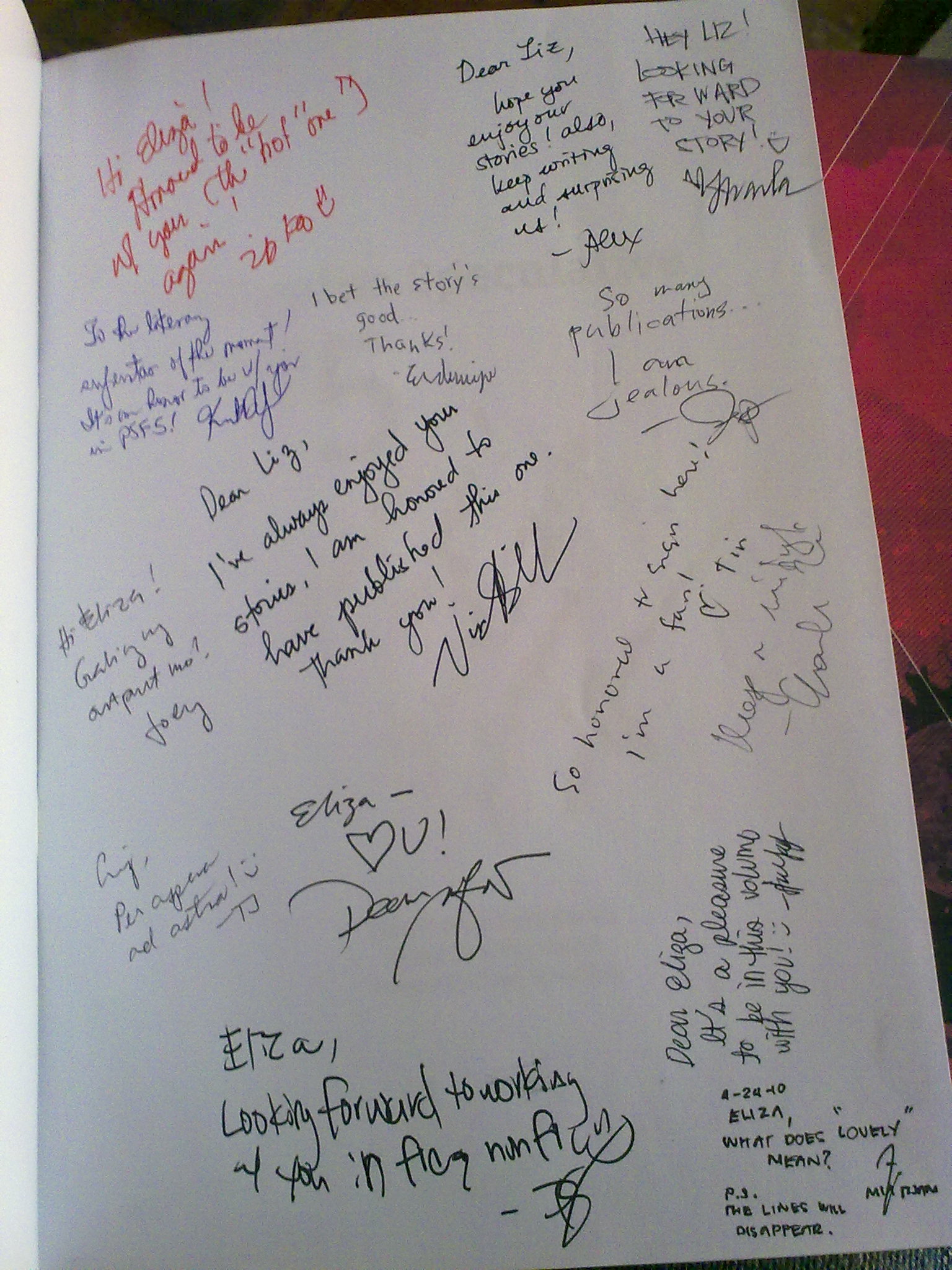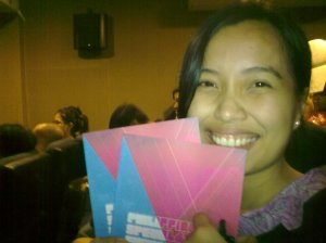 Also, I discovered something while I was walking around the U-View Theater shopping for autographs: PEOPLE READ MY STUFF. This is a revelation! When I post plugs for my new fiction/poetry I usually don’t get responses, but at the launch co-contributors Isa Yap and Tin Lao actually approached me and said they’ve read my poetry online and loved it. Tin even said she’s a big fan, and that she was glad to finally meet me. Me! And I’m not even wearing my fuck-me shoes! How surreal. That made me feel warm all over. :D
