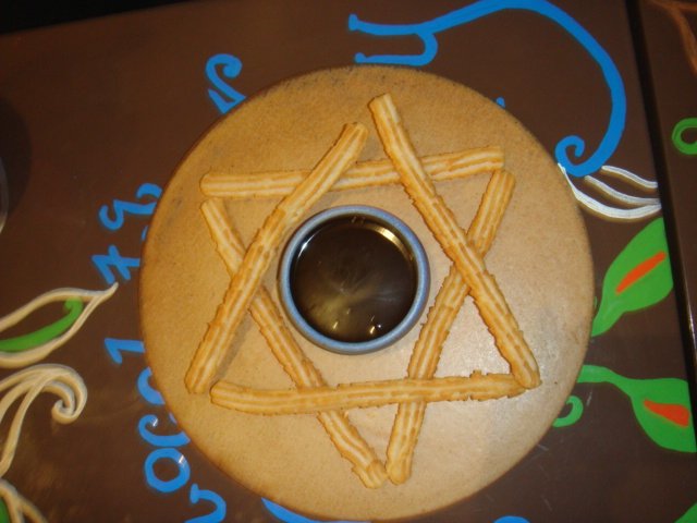 “Well I didn’t know the churros would arrive on a hell plate,” Jaykie said when this appeared on the table. I said it’s not a pentagram, but a Star of David. Jewish churros!