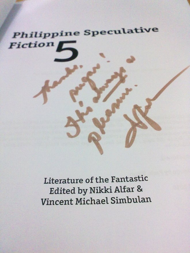 A lot has happened since then. Quite frankly, when I attended the book launch of Philippine Speculative Fiction’s fourth volume, my first publication in the anthology, I was more apprehensive than excited because I didn’t know anyone. I’ve never met the Alfars in person, and it was obvious a bunch of the writers there already knew each other, making fun of each other as they gave their speeches, and calling each other by their first names and what the hell am I doing here. Thank God Eula came with me, so I at least had someone to talk to during the event.